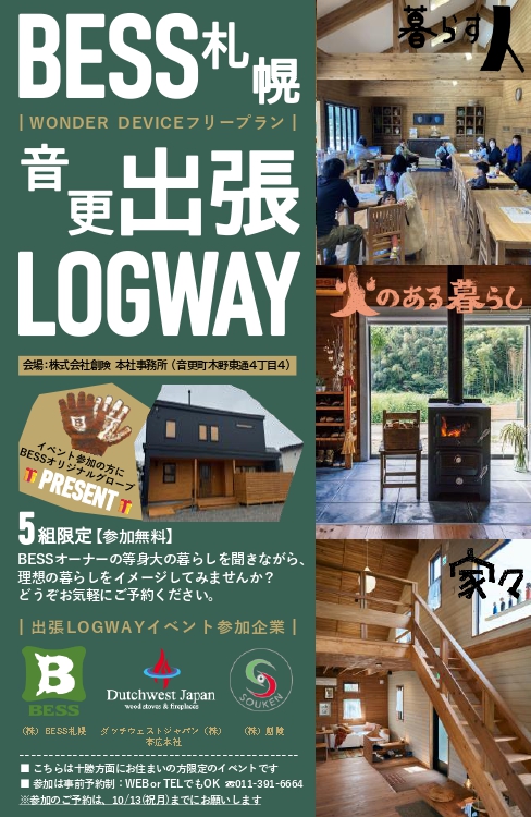 参加予約特典:BESSオリジナルアウトドアグローブ詳細・見学予約BESSの暮らしと薪ストーブについて「知って」「見て」「体験」できる出張イベントを開催いたします。